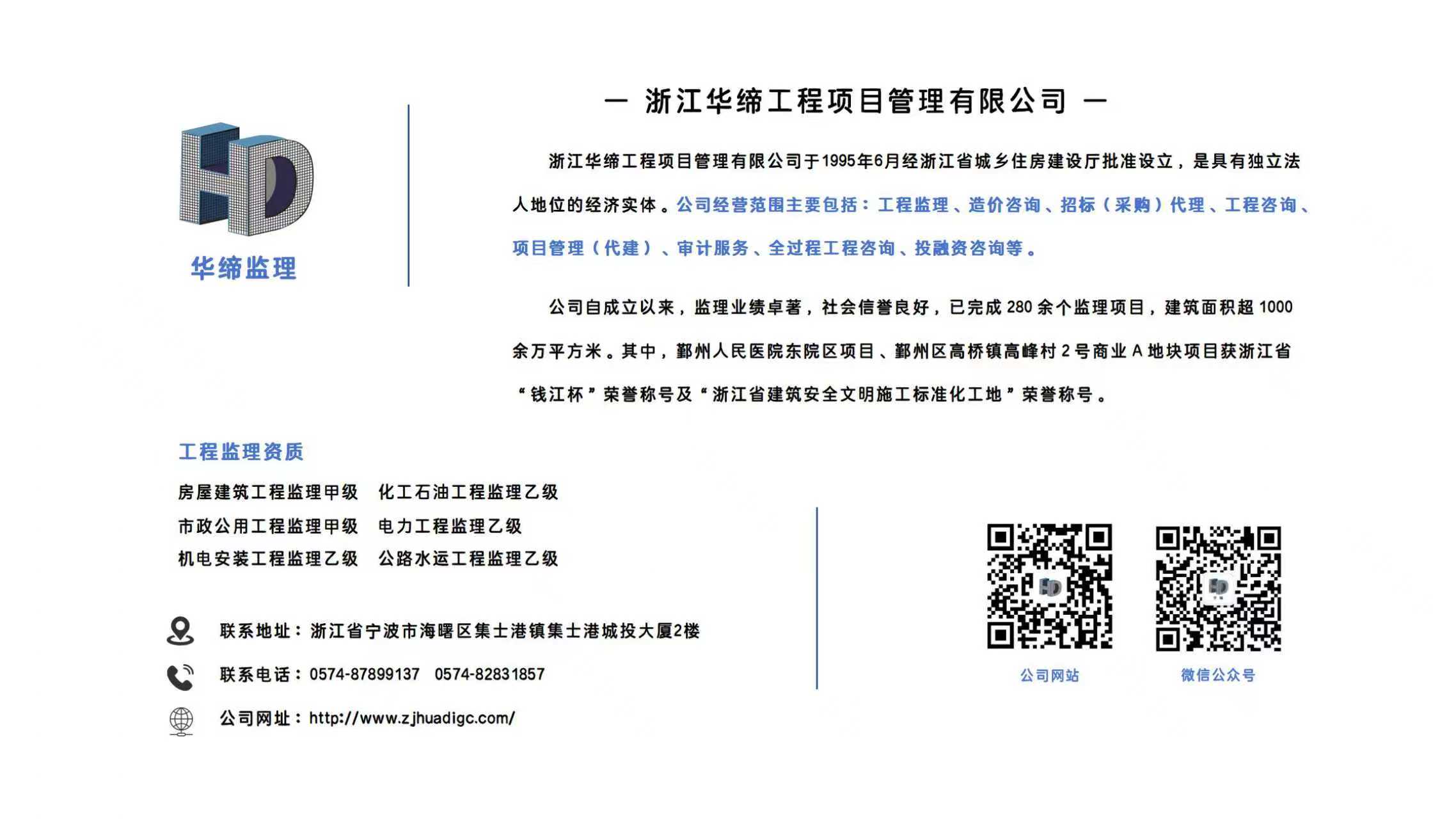浙江华缔工程项目管理有限公司(原宁波华地工程建设监理有限公司)于1995年6月经浙江省住房和城乡建设厅批准设立的专业化工程管理服务机构,是浙江省建设工程监理管理协议理事单位,宁波市全过程工程咨询与监理协会理事单位,宁波市海曙区建筑业协会监理单位。公司已先后通过ISO9001质量管理体系认证、ISO14001环境管理体系和ISO450001职业健康安全管理体系认证。深耕行业近三十载,浙江华缔目前围绕工程监理、造价咨询、招标(采购)代理、工程咨询、项目管理(代建)、审计服务、全过程工程咨询、投融资咨询等内容开展综合性咨询服务。